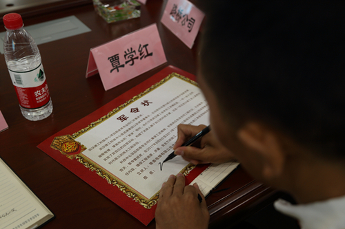 動(dòng)員大會(huì)結(jié)束后,由各參建單位簽訂軍令狀,保證項(xiàng)目按期完成各項(xiàng)節(jié)點(diǎn),順利交付使用。最后,由富強(qiáng)公司總經(jīng)理程曦與華達(dá)裝飾公司負(fù)責(zé)人張波完成武漢建工科技中心項(xiàng)目部“大戰(zhàn)一百天”動(dòng)員會(huì)揭牌儀式。